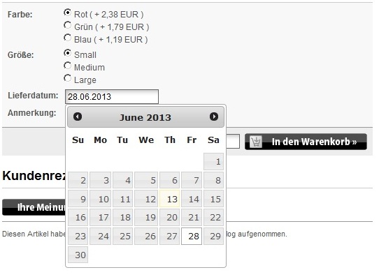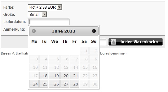 Durch weiter Anpassungen läßt sich die Usibility und Optik weiter optimieren. Für die Eingabe eines Lieferdatums bietet sich der Jquery Datepicker an. Beispiele dazu findet man auf den folgenden Screenshots.